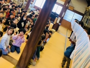 大きな松や餅やミカンで飾られた本堂でおまいり 年長組は「おとき」をいただき みんなできむちゃんの紙芝居を見て大笑い