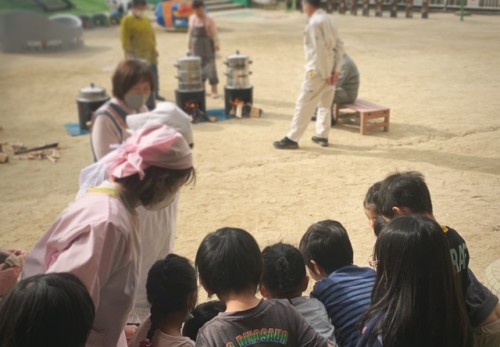 地域のみなさんや保護者会といっしょに。 練った米粉を木型でおこして、 蒸篭(せいろ)で蒸したら出来上がり。 どんな味がしたかな?